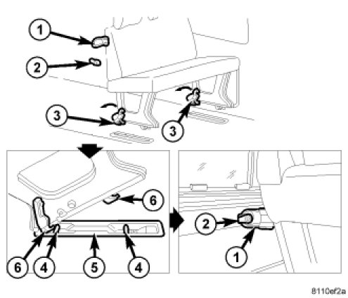 2. Slide seat forwards with some force as far as it will go, until the release levers (3) are heard to engage and all release levers are parallel to the vehicle floor.
