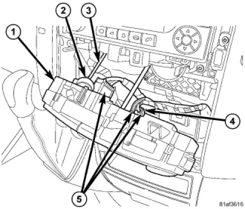 2. Connect the wire harness connectors (5) to the back of the A/C-heater control (1) and engage the connector lock (4). Make sure the connector lock is fully engaged.