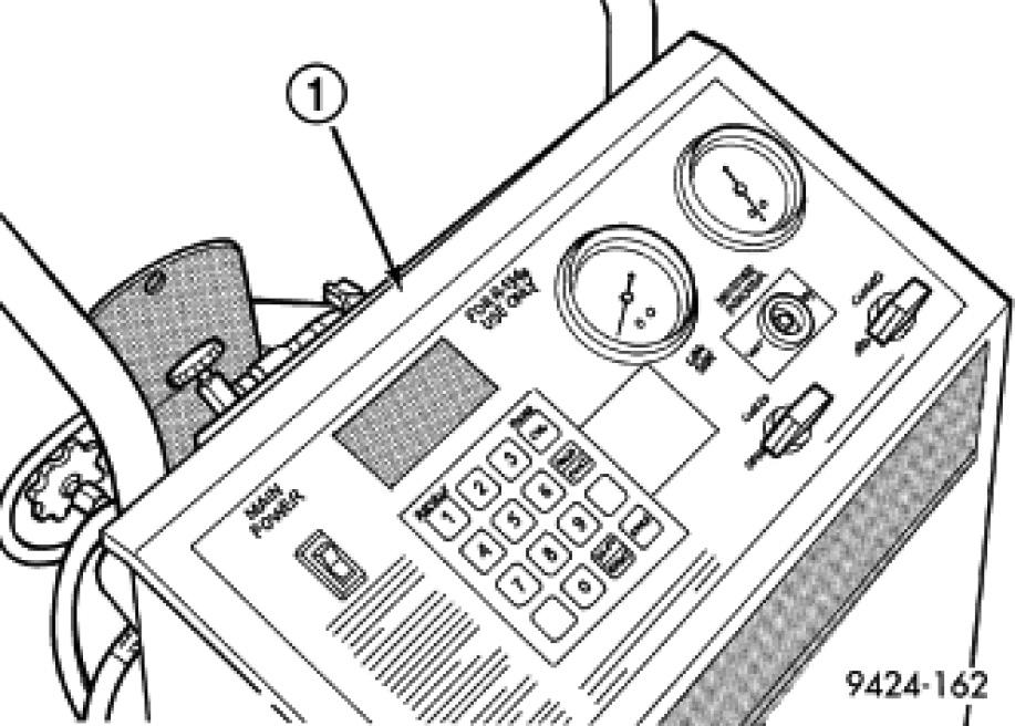 An R-134a refrigerant recovery/recycling/charging station (1) that meets SAE standard J2210 must be used to recover the refrigerant from the R-134a refrigerant system. Refer to the operating instructions supplied by the equipment manufacturer for the proper care and use of this equipment.
