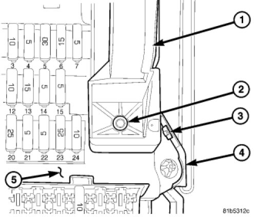 2. Insert the two posts integral to the upper edge of the fuse/relay block #1 (5) into the holes in the upper end of the mounting bracket behind the instrument panel.