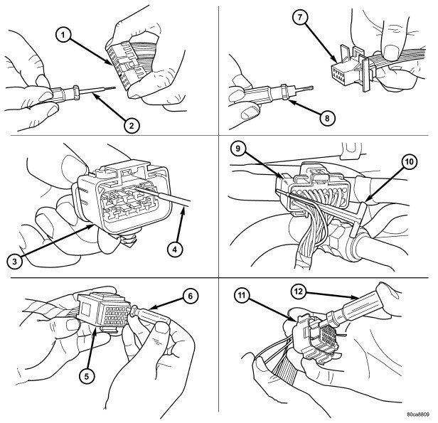 6. Position the connector locking finger away from the terminal using the proper special tool. Pull on the wire to remove the terminal from the connector.