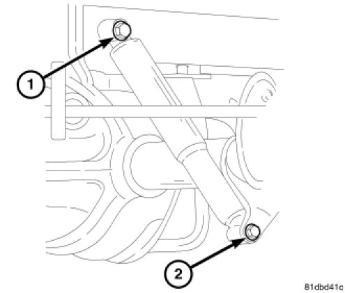 To check Rear curb height measure the distance between the rear shock upper bolt (1) head to the lower bolt head (2).