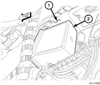 3. Remove the two nuts that secure the Automatic Headlamp Leveling Module (AHLM) (2) to the weld studs on the right cowl side inner panel.