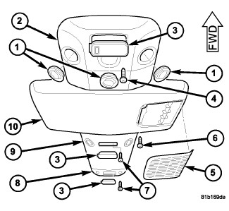 5. Install the front, center and rear roof duct trim panels (2, 9 and 8) and retaining screws (4 and 7). Tighten the screws to 2 Nm (17 in. lbs.).