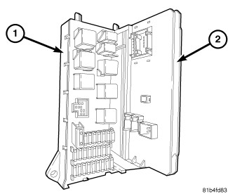 The Body Control Module (BCM) (also known as the Signal Acquisition and Actuation Module/SAM) (2) is located beneath the driver side end of the instrument panel in the passenger compartment, where it is secured to the fuse and relay block (also known as the SRB) (1). The fuse and relay block is the interface between the vehicle wire harnesses. The fuse and relay block also contains the fuses and relays used to protect and operate many of the electrical circuits in the vehicle.