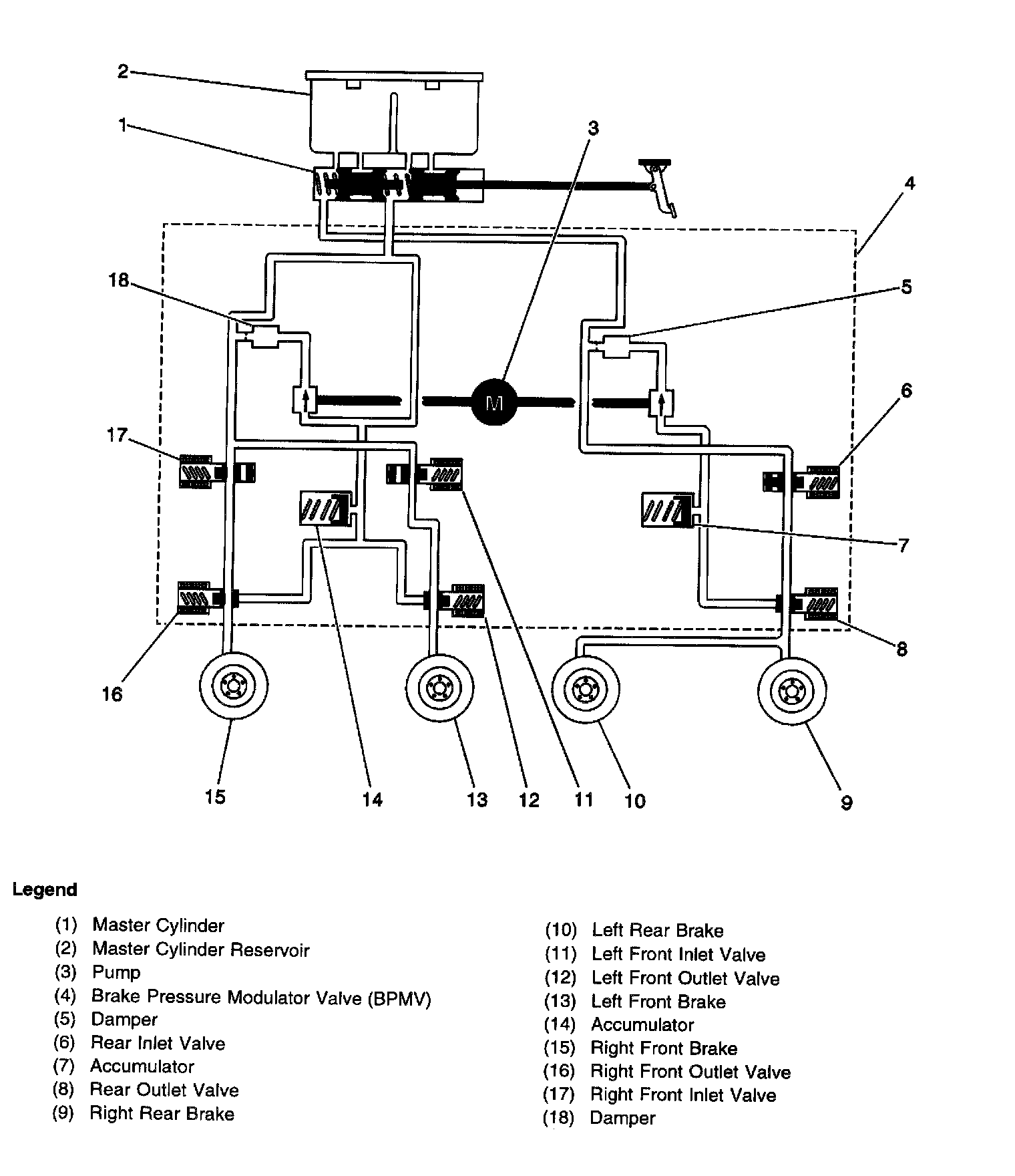 If more pressure is required, more fluid is drawn from the master cylinder (2) and applied to the brakes (7, 10). The driver will feel pedal pulsations or pedal drop. This is normal and expected when in the antilock mode.