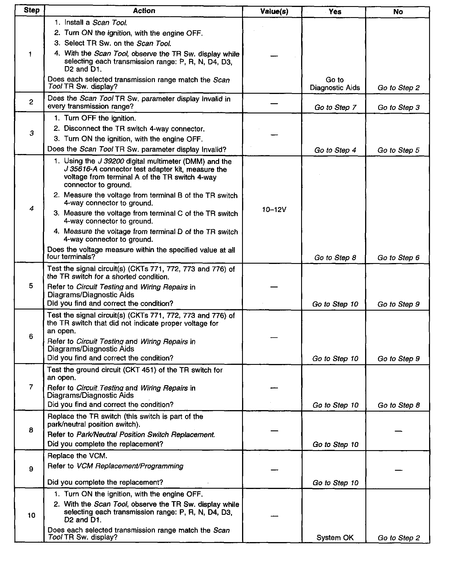 4. This step tests the TR switch wiring for an open or the lack of the signal voltage from the VCM.