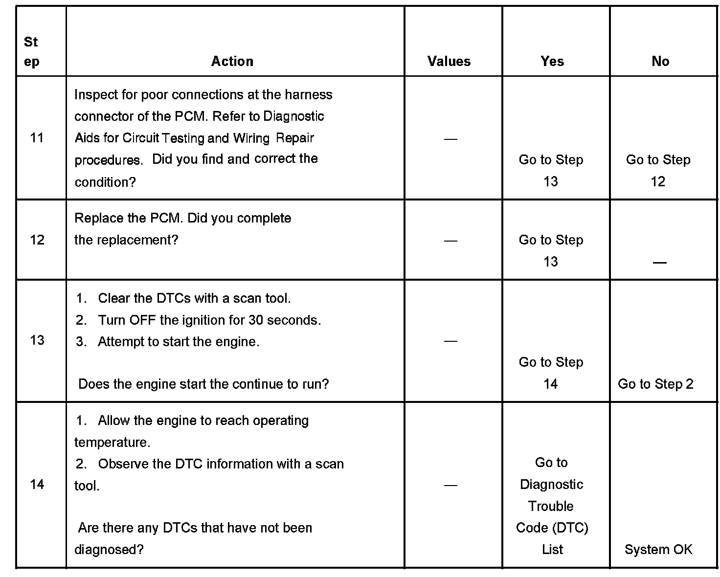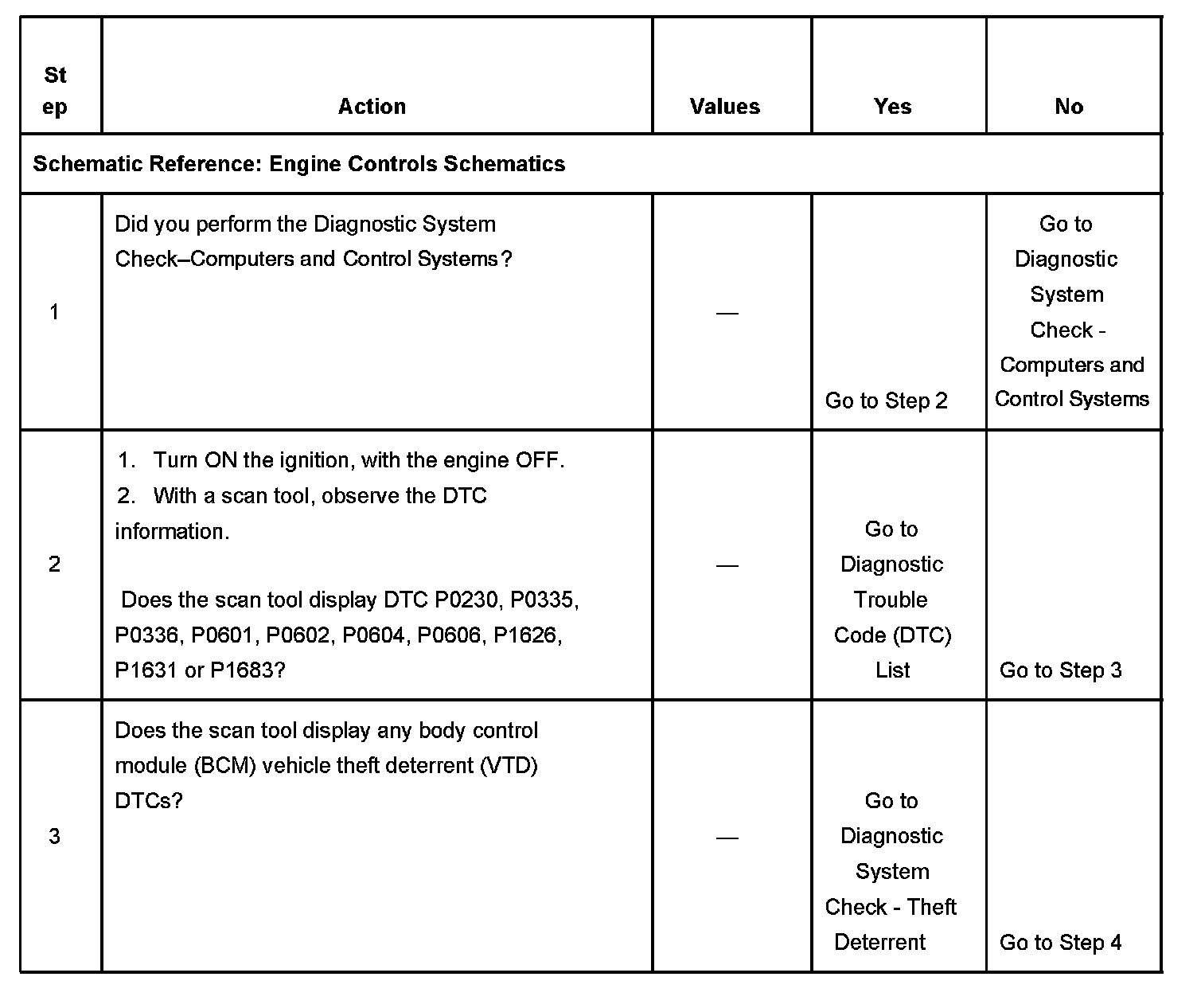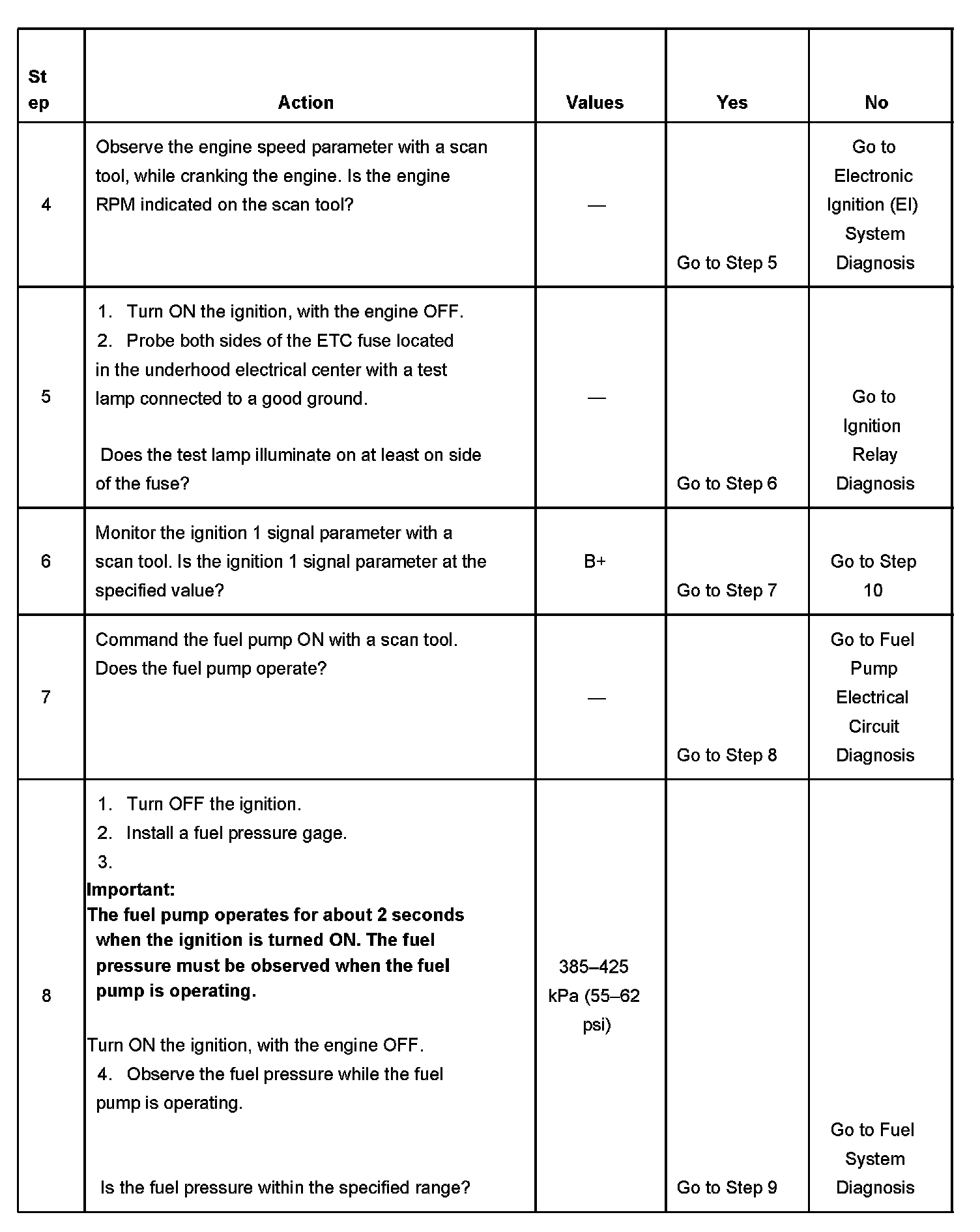 DESCRIPTIONThe Engine Cranks but Does Not Run diagnostic table is an organized approach to identifying a condition that causes an engine to not start. The diagnostic table directs the service technician to the appropriate system diagnosis. The diagnostic table assumes the following conditions are met: