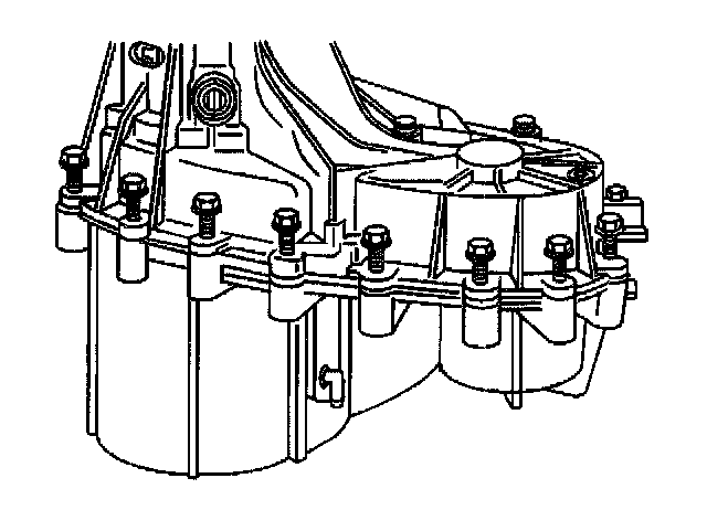 15. Remove the transfer case bolts, washers, and brackets.
