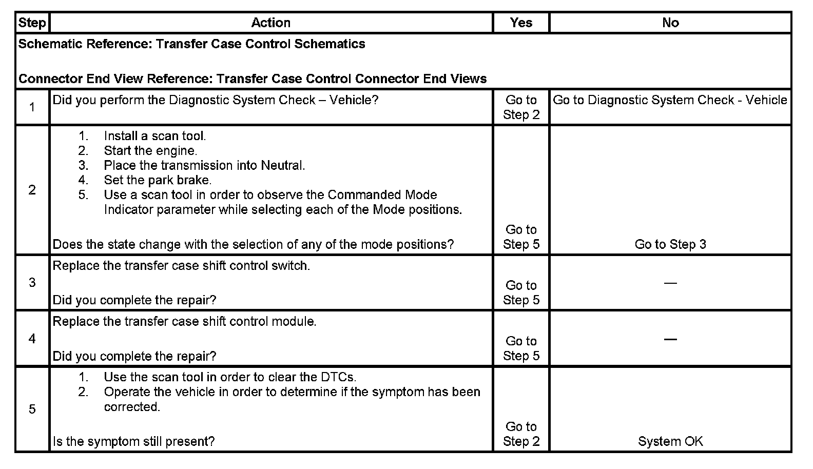 When each switch is depressed, the switch completes a circuit through the respective resistor. The transfer case shift control module continuously monitors the switch input to determine which of the following buttons were selected by the driver: