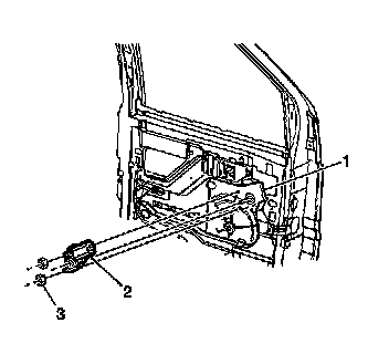 4. Remove the nuts (3) that retain the power window motor (2) to the front door module (1).