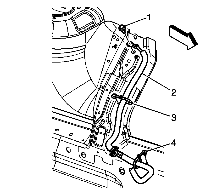 4. Install the battery negative cable extension cable clip (4) to the front compartment side rail.