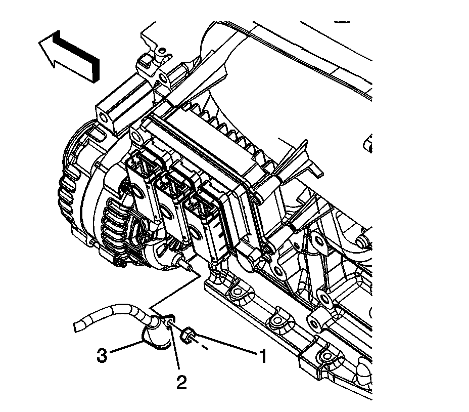 8. Remove the battery positive cable harness from the fir-tree retainer on the powertrain control module (PCM) bracket.