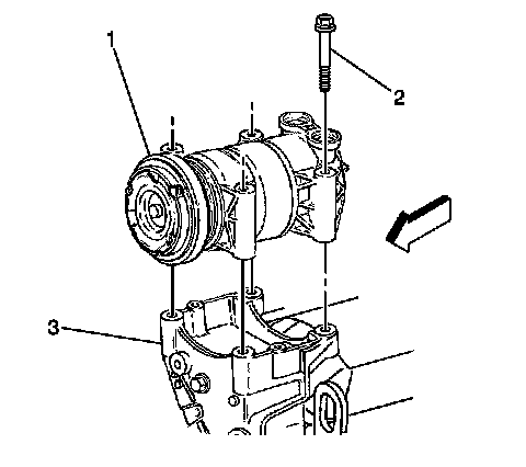 7. Remove the mounting bolts (2) from the compressor.