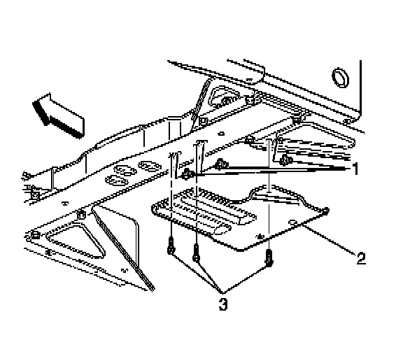 1.Install the transfer case shield (2) to the transmission support. Ensure that the J-nuts (1) are in place.