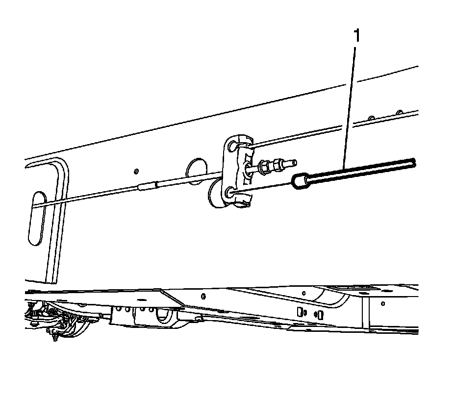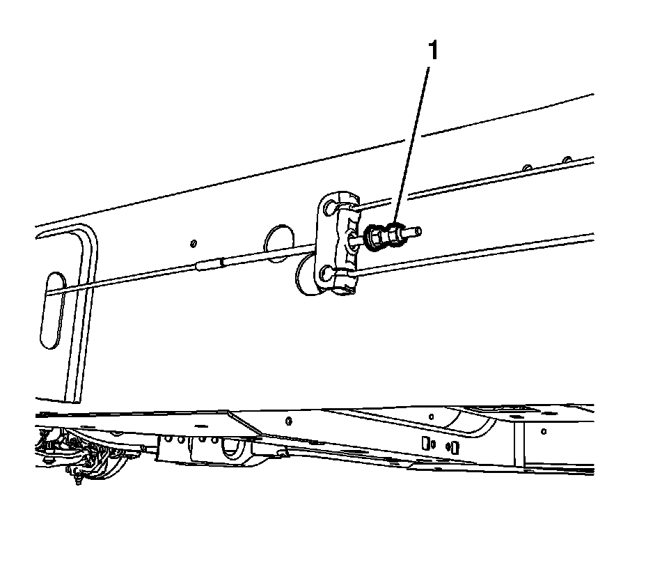 2. Install the park brake cable to the rear axle bracket by pulling the cable conduit (1) rearward and inserting the cable conduit into the rear axle bracket.