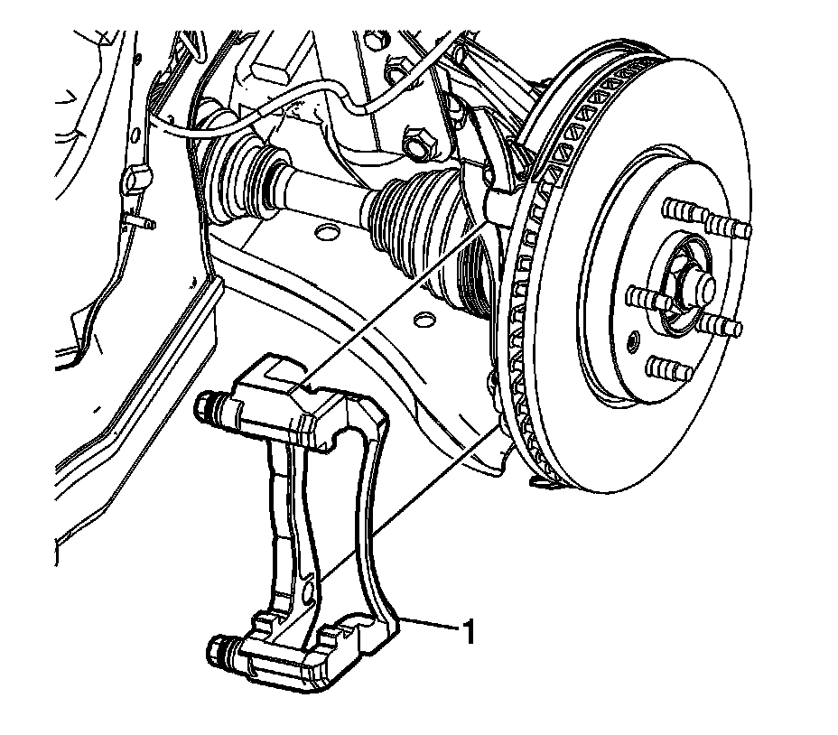 Support the brake caliper with heavy mechanic wire, or equivalent, whenever it is separated from its mount and the hydraulic flexible brake hose is still connected. Failure to support the caliper in this manner will cause the flexible brake hose to bear the weight of the caliper, which may cause damage to the brake hose and in turn may cause a brake fluid leak.