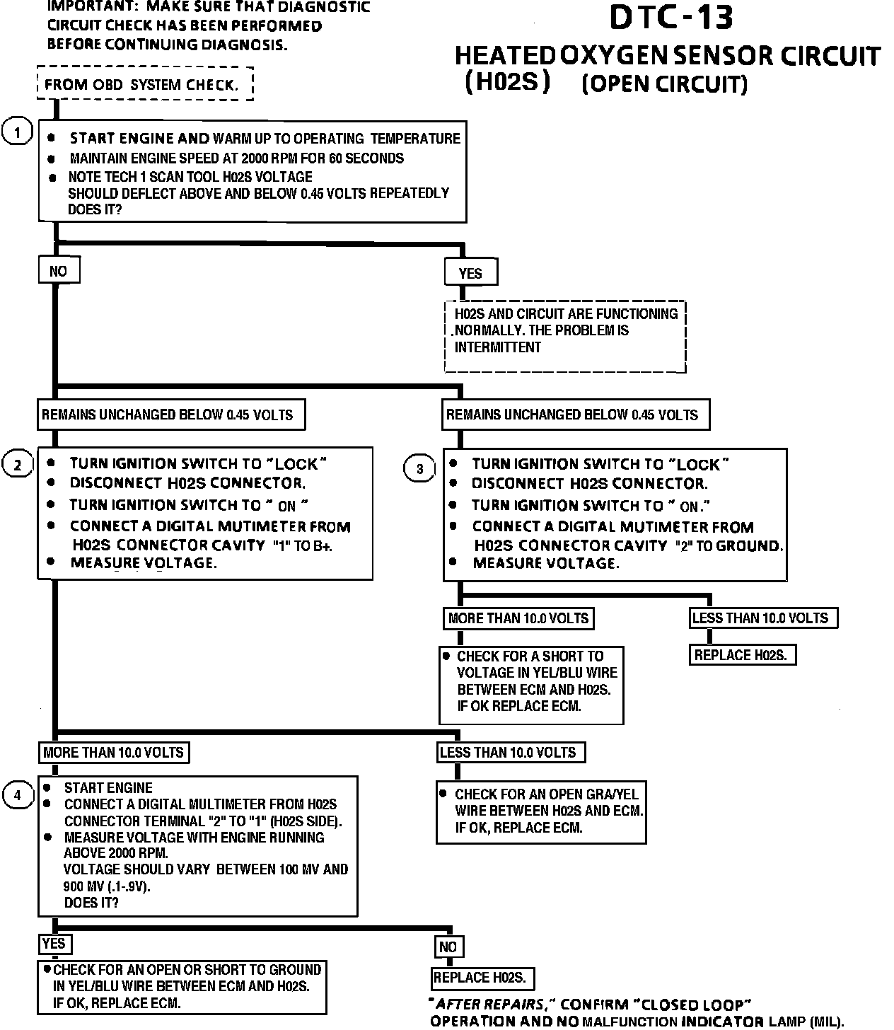 The heated oxygen sensor (H02S), produces a voltage that varies between .1 volt and .9 volt under normal operating conditions. The ECM monitors this voltage and determines if the exhaust is lean or rich. If the voltage input at the ECM is about .1 volt, the exhaust is lean, and if the voltage input is about .9 volt, the exhaust is rich. The (H02S) has a built-in heater that keeps the (H02S) at normal operating temperature while the engine is running. DTC 13 will set if the following conditions are met for more than 30 seconds continuously, and the conversion value of the H02S output voltage does not exceed 0.45 volts: