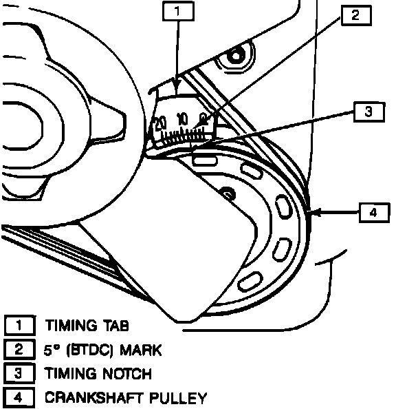 ^ While observing the timing mark slowly rotate the distributor until a 5° BTDC reading is obtained.