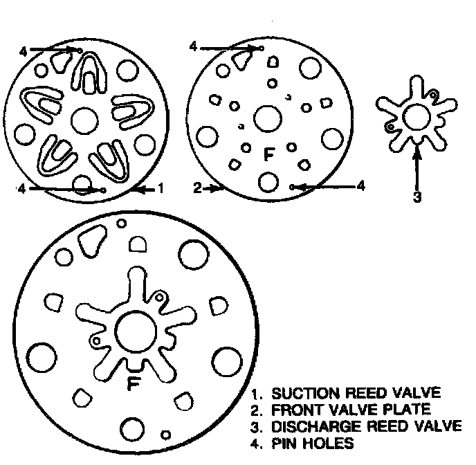 c. Install the suction reed valve, front valve plate, and discharge reed valve onto front cylinder top. For the installation locations, refer to the drawing.