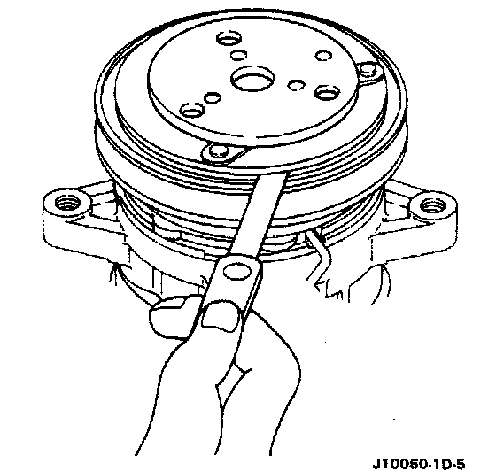 Check the appearance of the pulley assembly. If the frictional surface of the pulley shows signs of excessive grooving due to slippage, both the pulley and drive plate should be replaced. The frictional surfaces of the pulley assembly should be cleaned with a suitable solvent before reinstallation.