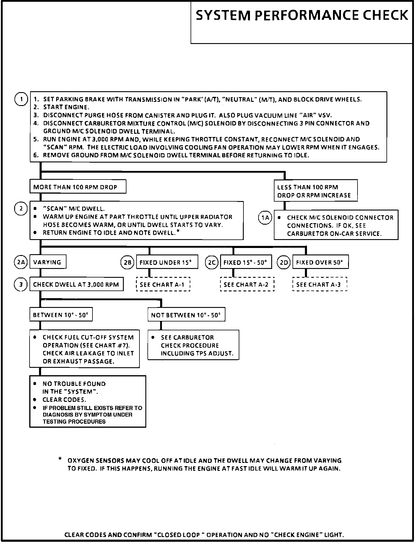 1. Checks for the ability of the carburetor main metering system to change the Air/Fuel mixture. Disconnecting the M/C solenoid makes the carburetor operate full-rich (O% Duty Cycle) and reconnecting it with the dwell lead grounded makes it operate full-lean (100% Duty Cycle). Normal response is for rpm to drop, as M/C solenoid is reconnected. Normal drop should be within a 300 to 1000 rpm range.