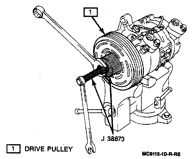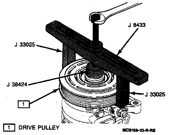 ^ Using a J 8433 heavy duty pulley puller, J 33025 clutch coil puller legs and a J 38424 pulley puller adapter, remove drive pulley.