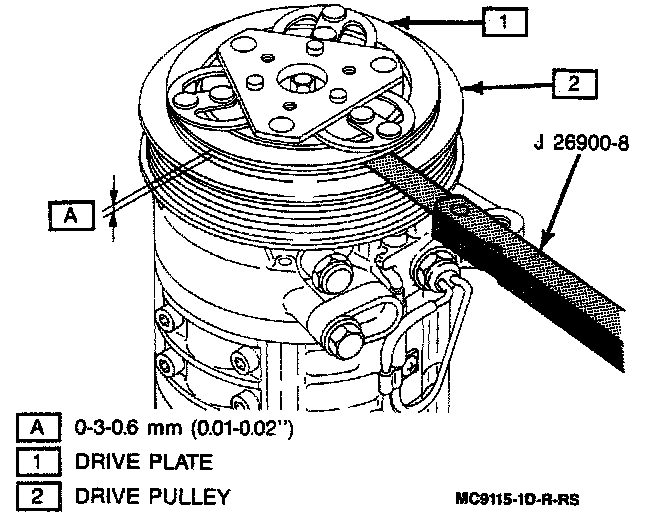 ^ Drive plate-to-drive pulley clearance using a J 26900-8 thickness gage. Standard clearance is 0.3 to 0.6 mm (0.01 to 0.02-inch). If clearance is less than 0.3 mm (0.01-inch), install adjusting shims as required to bring clearance into specification. Shims are available in 0.1 mm (0.0039-inch), 0.3 mm (0.01-inch) and 0.5 mm (0.0197-inch) sizes.