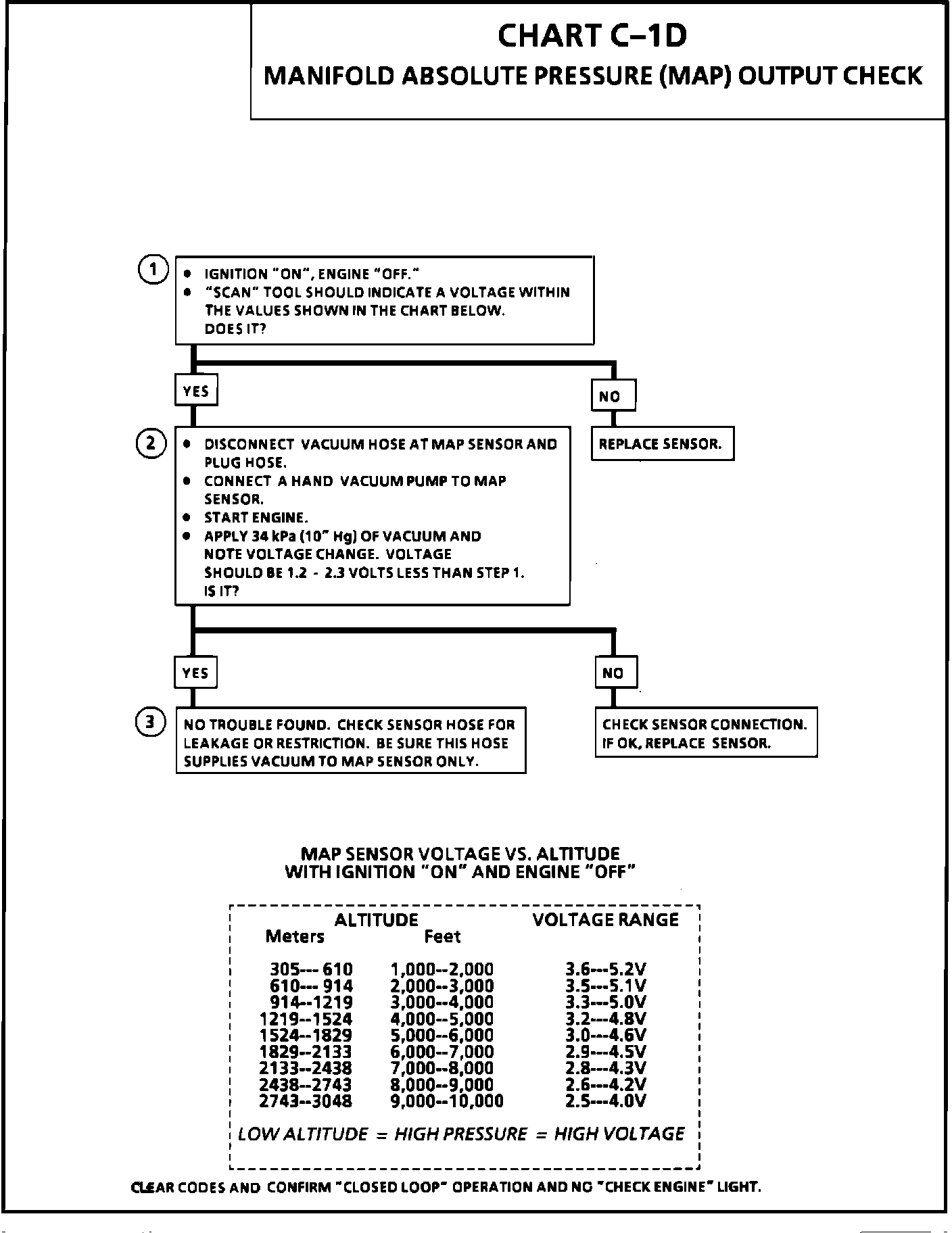 1. Checks MAP sensor output voltage to the ECM. With the ignition "ON" and the engine stopped, the manifold pressure is equal to atmospheric pressure and the signal voltage will be high. This voltage, without engine running, represents a barometer reading to the ECM. Comparison of this BARO reading with a known good vehicle with the same sensor is a good way to check accuracy of a suspect sensor. Readings should be the same +/- .4 volt.