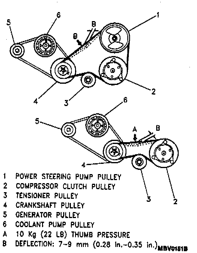 NOTE: Measure power steering pump drive belt deflection using thumb pressure (approximately 10 kg (22 lbs.). A properly adjusted drive belt should deflect 7 to 9 mm (0.28 to 0.35 inch).