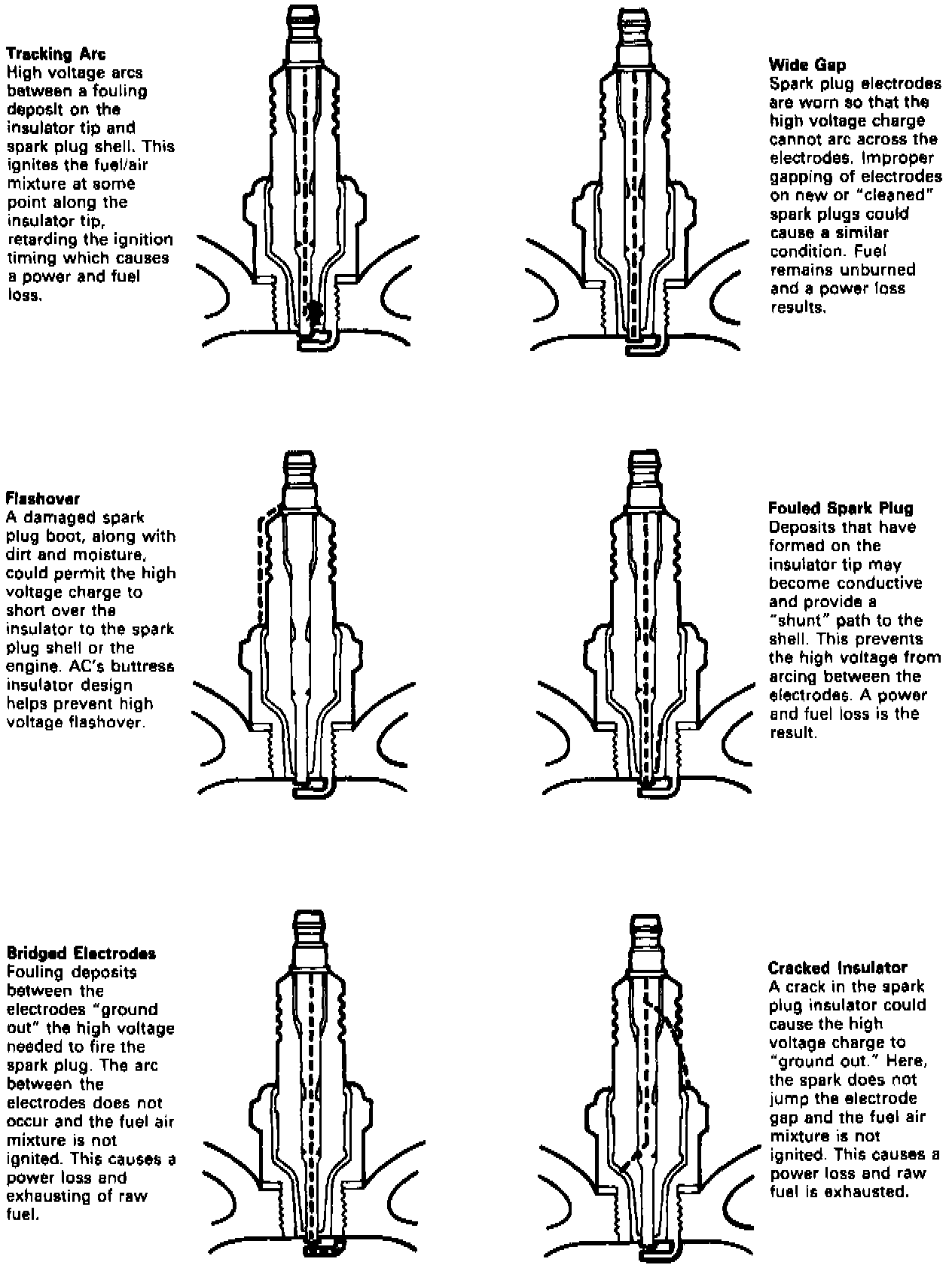 Worn or dirty spark plug assemblies may give satisfactory operation at idling speed, but under operating conditions they frequently fail. Faulty spark plug assemblies are indicated in a number of ways: poor fuel economy, power loss, loss of speed, hard starting and generally poor engine performance. Spark plug assemblies may also fail due to carbon fouling, excessive gap, or a broken spark plug assembly insulator. Descriptions of these failure modes follow:
