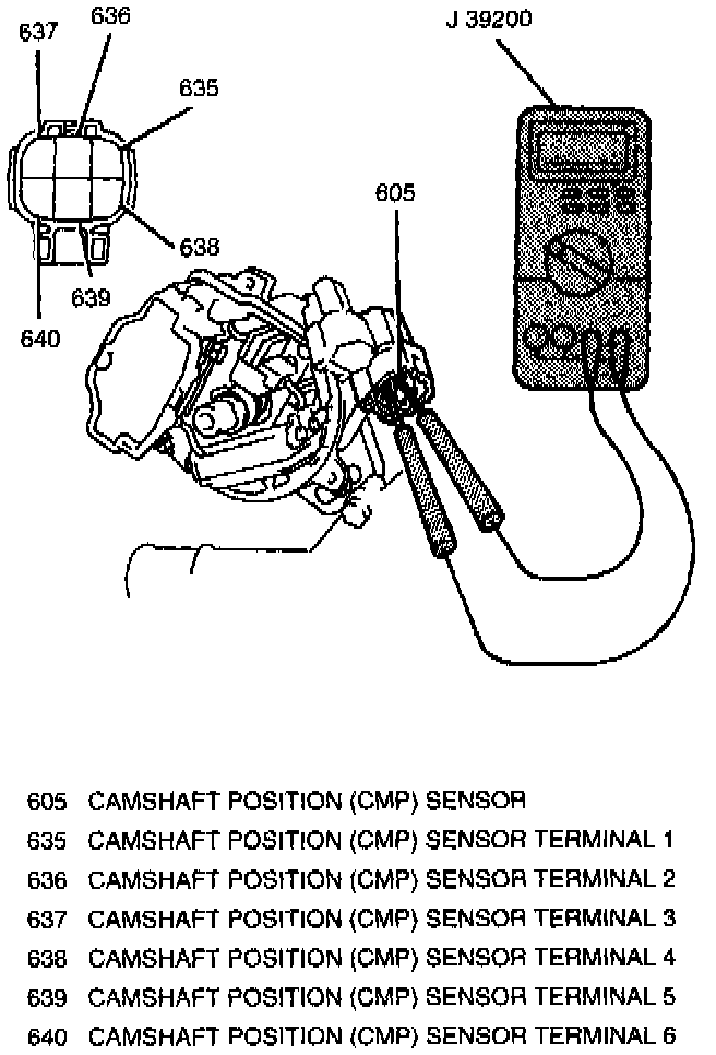 4. The resistance of distributor connector C1 when hot, between terminals 2 and 5. using a J39200. If the CMP sensor resistance is nor between 475 and 650 ohms, replace the distributor housing.
