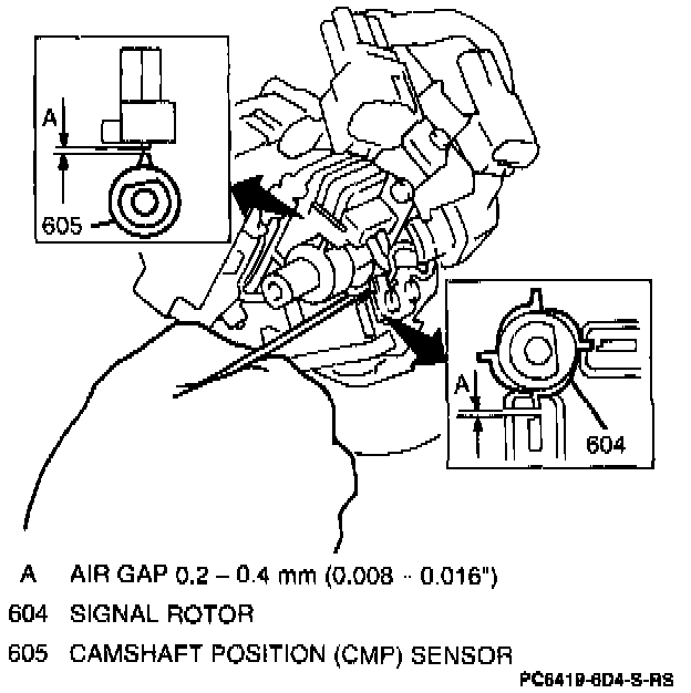 5. Air gap between the signal rotor and camshaft position (CMP) sensor. If the air gap is not between 0.2 - 0.4 mm (0.008 - 0.016 inch), replace the distributor housing.