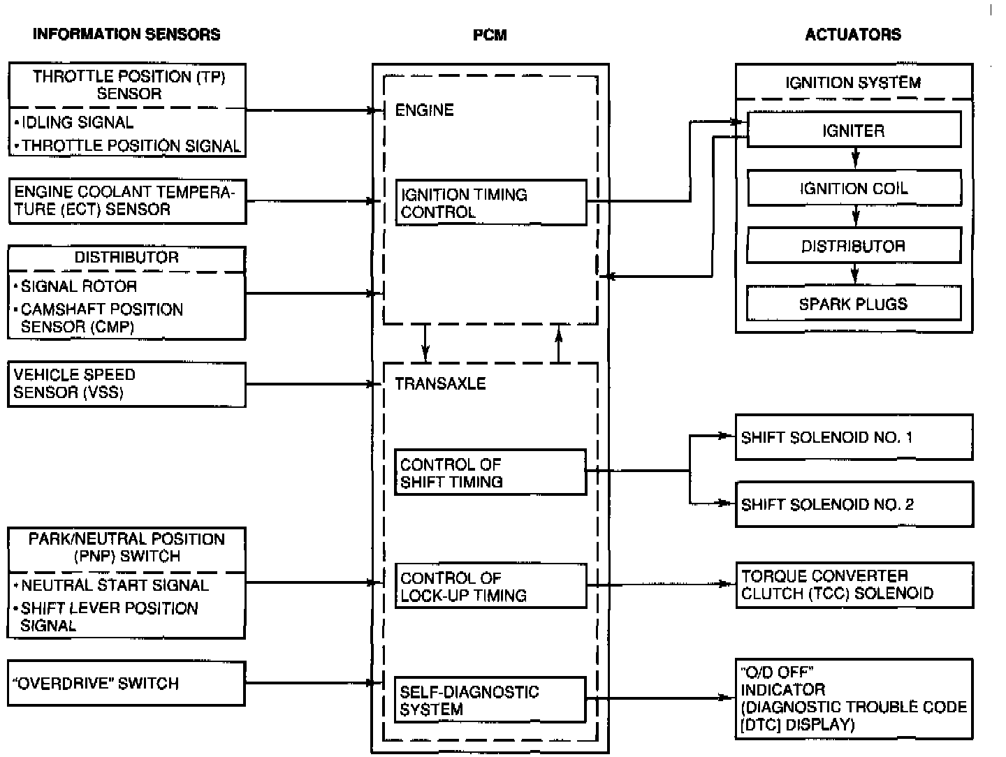 The electronic control system of the A245E 4-speed automatic transaxle provides precise control of the gearshift timing and torque converter clutch (TCC) lockup timing in response to driving conditions which are evaluated by the powertrain control module (PCM). The A245E electronic control system can be divided into three main component groups: information sensors, the PCM and actuators. The electronic control system is also equipped with a self-diagnosis system and a fail-safe mode. The self-diagnosis system will diagnose malfunctions of electronically controlled components and will warn the driver of a malfunction by a continuous on-off blinking of the "O/D OFF" indicator. The fail-safe mode will provide the driver with minimum driveability until the malfunction can be corrected.