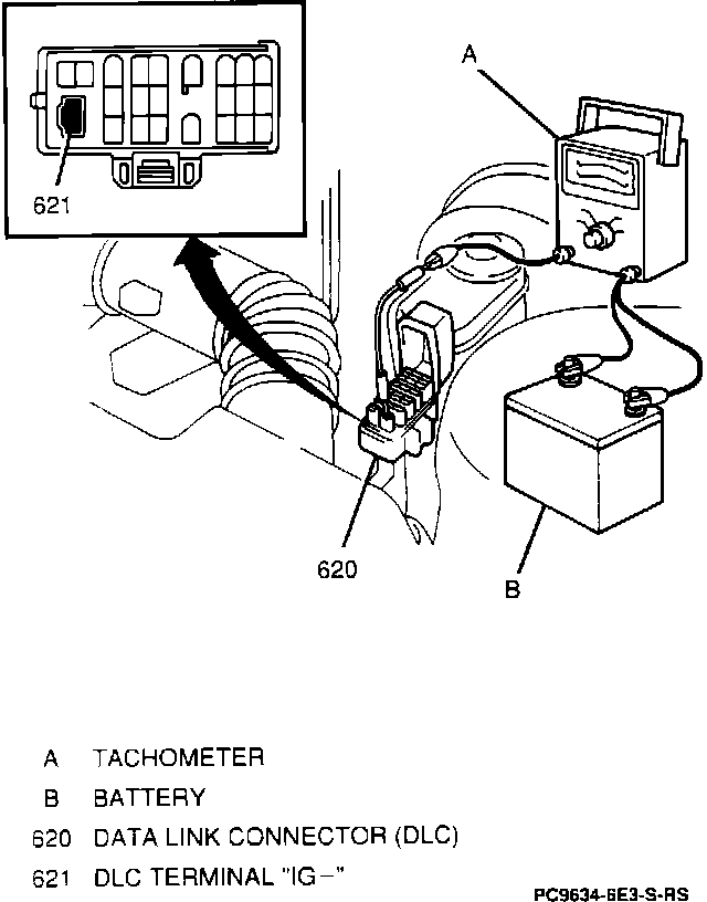 2. Connect a tachometer between battery negative and DTC connector "IG-".