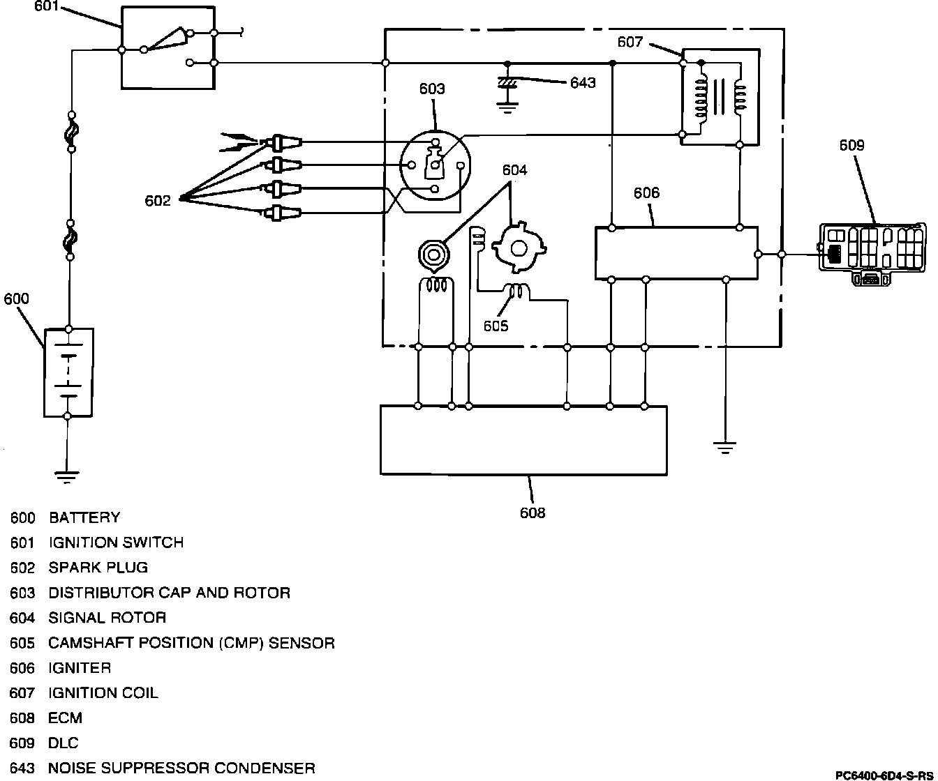 The ignition circuit consists of the battery, distributor, ignition switch, spark plugs, igniter, and primary and secondary wiring.All models are equipped with an electronic spark control (ESC) ignition system which is monitored and controlled by the powertrain control module (PCM).