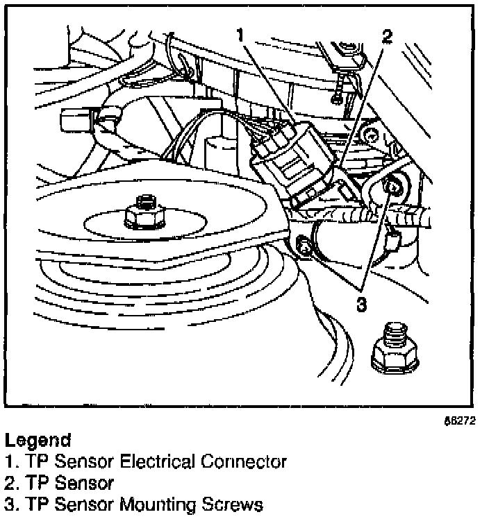 5. While observing TP sensor voltage on the scan tool, turn the TP sensor until the voltage reading is 0.98 to 1.02 volts. Tighten the TP sensor screws to 2.0 Nm (18 lb. in.).