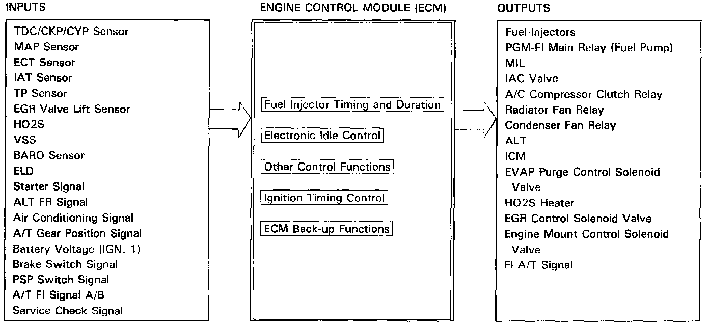 When an abnormality occurs in a signal from a sensor, the ECM supplies ground for the MIL and stores the code in erasable memory. When the Ignition is initially turned on, the ECM supplies ground for the MIL for two seconds to check the MIL bulb condition.