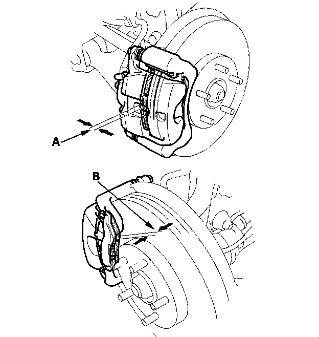 2. Check the thickness of the inner pad (A) and outer pad (B). Do not include the thickness of the backing plate.
