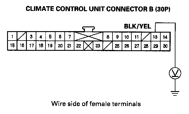 6. Check for continuity between the No. 29 terminal of climate control unit connector B (30P) and body ground.