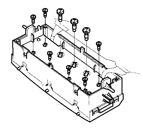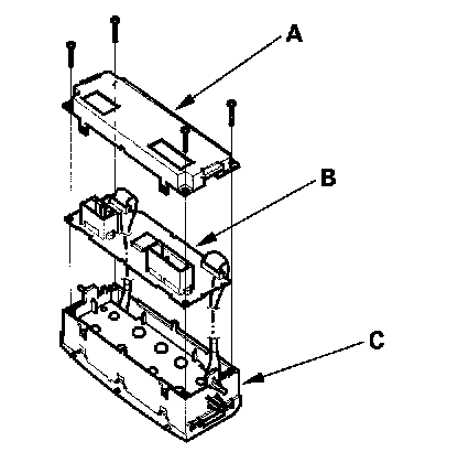 2. Remove the self-tapping screws, then carefully separate the climate control unit cover (A) and the control unit (B) from the control unit display (C). Do not kink or pull on the wires between the display and the control unit. Do not touch the electronic components on the printed circuit board in the control unit.