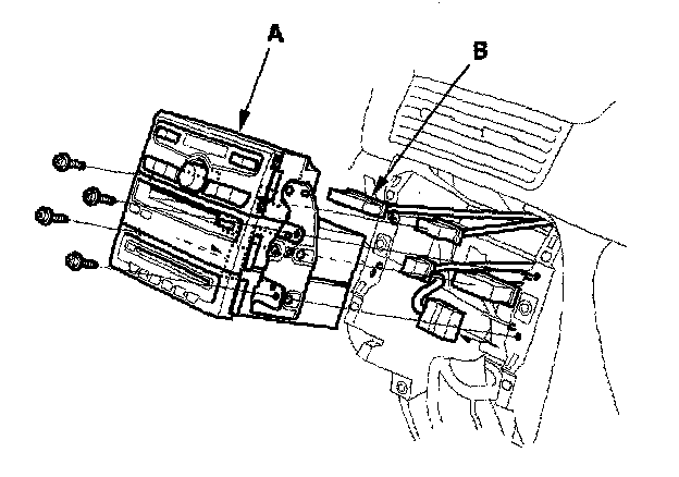2. Remove the screws, and remove the climate control unit (A) with the brackets from the dashboard, then disconnect the connectors (B).