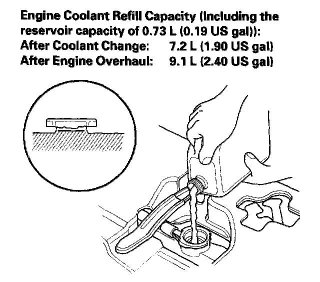 12. Check the level in the radiator, and add Honda All Season Antifreeze/Coolant Type 2, if needed.