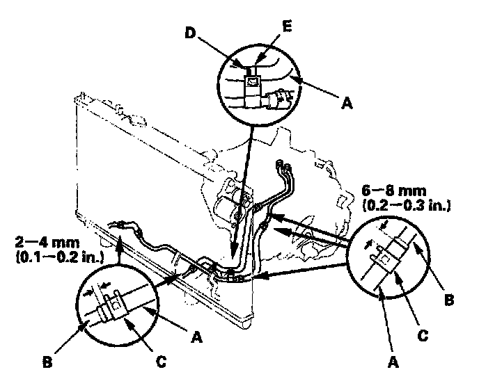 Clamp the ATF cooler hose with the white mark (D) on the clamp (E).