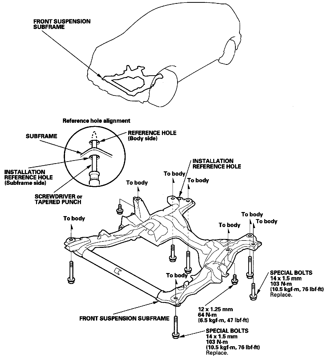 - When installing, align both installation reference holes in the subframe with both reference holes in the body using a screwdriver or tapered punch as a guide.