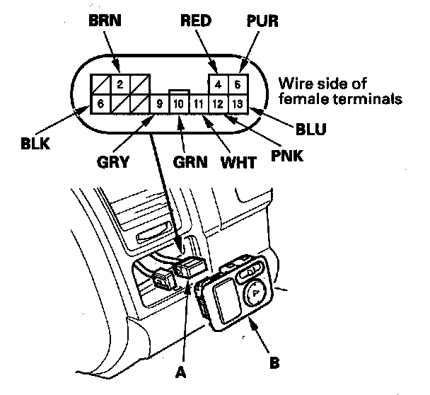 2. Disconnect the 13P connector (A) from the power mirror switch (B).