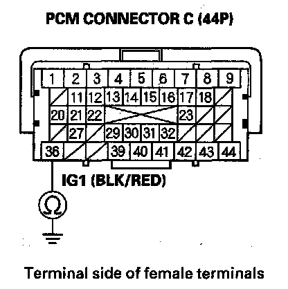 73. Check for continuity between body ground and PCM connector terminals B1, B36, C2, C40, and C44 individually.