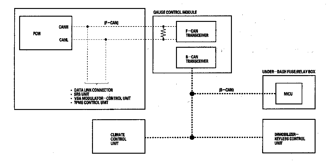 The MICU (built into the under-dash fuse/relay box) is one of the B-CAN components. The MICU controls many systems related to the body controller area network, and also works as a gateway to diagnose the other B-CAN circuits with the HDS.