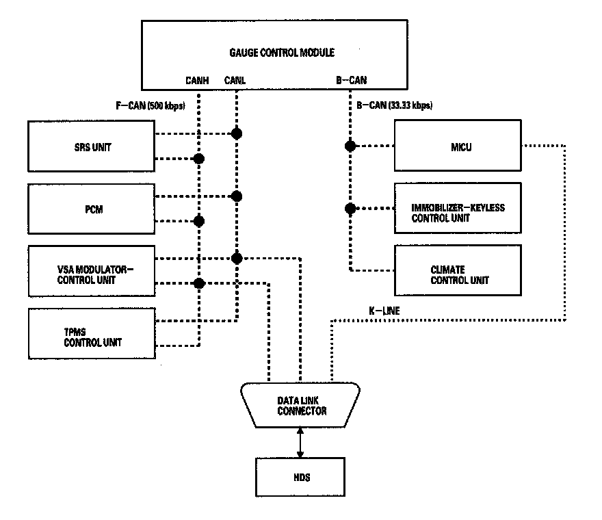 By connecting the HDS to the data link connector (DLC), the HDS can retrieve the diagnostic results from the MICU via a diagnostic line called K-LINE. The K-LINE is distinguished from the CAN line, and connected to the CAN related ECUs. The MICU is a gateway between the HDS and B-CAN related ECUs, and sends B-CAN diagnostic results to the HDS. When performing a function test with the HDS, the HDS sends an output signal through the K-LINE to the MICU. The MICU either relays the request to another ECU, or commands the function its self.