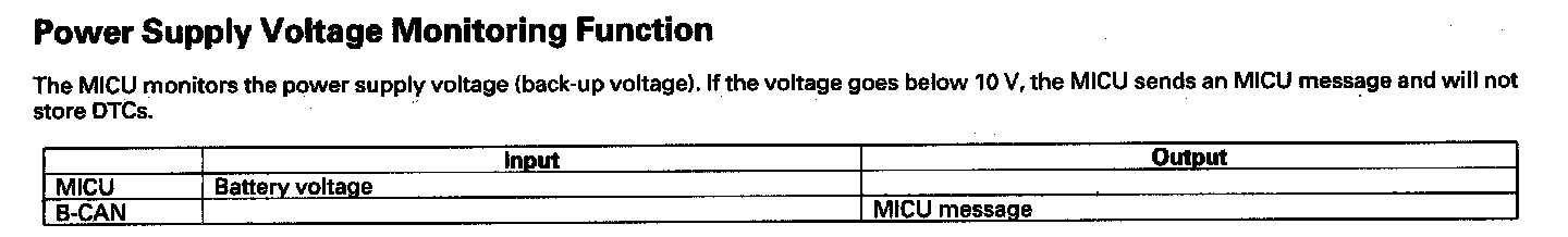 When any of the data from the B-CAN circuit cannot be received within a specified time, or an unusual combination of the data is recognized, the MICU moves to the software fail-safe mode. The data that cannot be received is forced to a pre-programmed value.